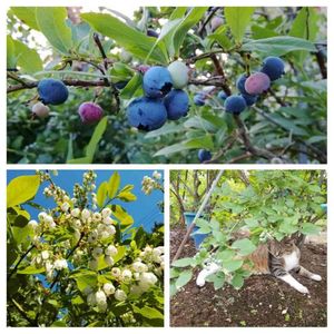 ブルーベリーの実が色づいてきました✨ ブルーベリーの花(5月頃) ブルーベリーの木の下でくつろぐタロー君😽