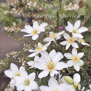 『クレマチス カートマニー ジョー』 この時期にしか会えないので、再び登場。 実はもう最盛期は過ぎちゃったっぽい(;_;)命短し。。。 後ろの白い小花は、ブルーベリーの花♪