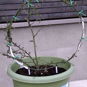 雪あかりはこうして誘引しるというのをネットで見つけやってみました。 胡蝶蘭の頑丈な支柱を曲げて💦リング仕立てに。細い柄だだけにするらしいけど、枝が足りなくてこんな状態😅