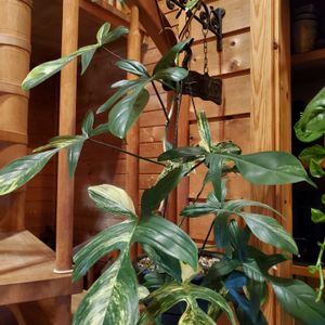 朝日の窓辺 真ん中のフィロデンドロンフロリダなんですが、うちのネペンテスそっくり😂 上に伸びるスイッチ入って伸び続けていたのですが、バランスを崩して下向きになってからは美しい曲線美を描いてくれています。 どうしたいのかと言われるとわからないので、とりあえずそのまま。。