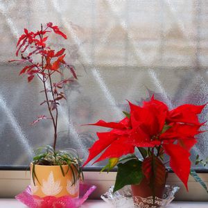 ツリー🎄はまた来年に。 窓辺にポインセチアと紅葉のモミジを🍁