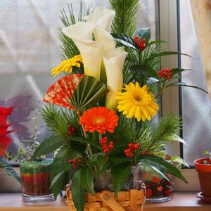 お正月飾り。 近くのお花屋さん、竹の代わりにカラーがセットで売られていました。 娘が選んだガーベラと一緒に、久しぶりのアレンジメント。