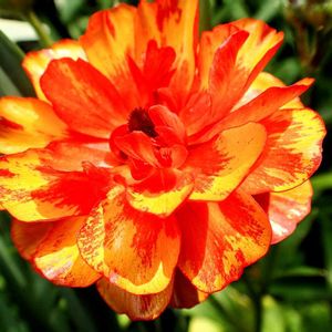 ぴかぴかラナンキュラス・ラックスのミノアンが咲きました🧡💛😍 すこし前に、ラックスの話題が出て、今はラックスを持ってないという話をしていたのですが、やっぱり欲しくなってネットで苗を購入してしまいましたヾ(≧∇≦)ノ 花無しのポット苗で、ミノアン、アリアドネ(ピンク)、アルテミス(黄色)の3種です。前に育てていたのは長崎ラックスと呼ばれていたもので、一重の大きな花でオレンジ、黄色、の2種と、八重のパープル、その後、長崎ラックスは見かけなくなり、ピンクやその他の多彩な品種のラックスが販売されるようになり、いくつか買い足したりしたのですが、やはり最初に買ったオレンジと黄色の一重の印象が鮮烈で、似た品種を探して購入したのですが・・・😅 ミノアンは、つやぴかの素敵なオレンジ色ですが、写真と違って一重ではなく八重のようです💦 でもきれいに咲いてくれたので満足しています🎶 他の品種もそのうち咲いてくれると思うので、楽しみに待ちます~咲いたらまたUPしますね🤗
