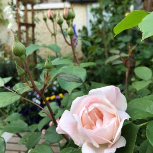 こんばんは😊 ウチにある2種類の薔薇の1つ、デスデモーナ💗 Desdemona (ダヴィッド オースティン作) 大きくならない子ですが、香り良く、蕾はピンク、咲き始めは淡いピンク、段々乳白色の優しい色になります。 蕾が28個💗🤍楽しみです💕 4月28日撮影