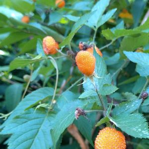 コジキイチゴ(乞食苺) バラ科キイチゴ属の落葉小低木 別名 フクロイチゴ(袋苺) 本州(東海地方以西)・四国・九州の山地に分布 果実の中が空洞で、その形が、弥生時代の土器「甑(こしき)」に似ていることから、コシキイチゴがなまって「コジキイチゴ」になったという説があるそうです。 なんだか、コジキでは、聞こえが悪いので、濁点をとってほしいです😅💧 茎には、棘と毛が密生していますが、 オレンジ色の実は大きくて、 ちょっと、美味しそうに見えます。 でも、以前、別の場所で、試食したことがあって、美味しいとはいえなかったので😅💧、 今回の試食は、見送りました😁