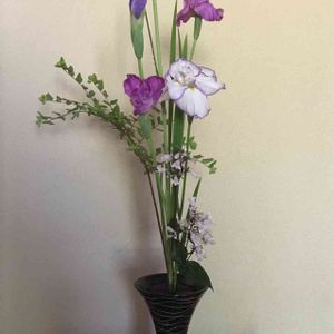各地で梅雨入りですね〜 こんな日は、爽やかなムラサキ色の濃淡で三種生け。 花材 ハナショウブ ペンステモン キンシバイ