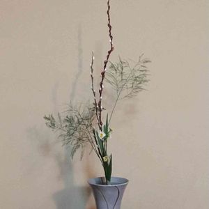 こんばんは。 生け花のおけいこに行ってきました。 今週は来週末の作品展の習作です。 花器は先生にお借りしました。 花器とデザインのイメージは決まりましたが 花材が、どうなるかは まだ未確定な状態です。 春らしい作品にしたいと思います。