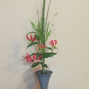 夏らしい生け花になりました *\(^o^)/* 花材 オクロレウカ オオバンソウ グロリオサ 風を感じさせる オオバンソウがいい働きしています〜♪