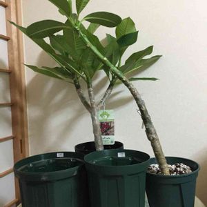 プルメリアにオススメ スリット鉢 緑色の鉢がどれもスリット鉢です、 水はけが良いのでプルメリアの栽培にはオススメです👌🏻✨ プルメリアは左側はジャングルジャックスのレッドジャック 難易度の高い赤を購入💦 タグを見たら凄く濃い赤で是非とも咲くのが見たい😆 右側はシンガポールホワイトこちらは耐寒性はとても弱いけど、持っているのはブラックティップになっていたので、2鉢目💦丸い葉っぱが特徴✨