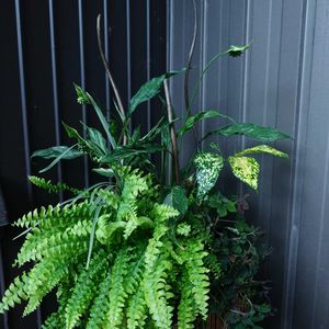 観葉植物の寄せ植え 数ヶ月前に寄せ植え講座で作りました 軒下で楽しんでます🌿 様々な形や色のグリーンを組み合わせて素敵な感じです♬ 黒く塗られた柳をさしたりとアクセントを加えるなどのアイディアも面白かったです 何より、この涼しげで手のかからない寄せ植えは夏にぴったりでした✌