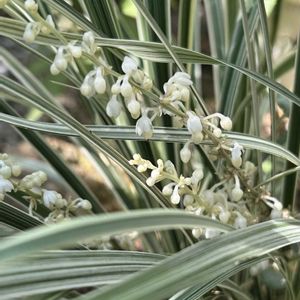 こんばんは♪ 🏷️白い水曜日 滑り込みします💨 ミスキャンタスの花 ユリ科ジャノヒゲ属の常緑多年草 リュウノヒゲの仲間 グレーがかった緑葉に白い縞斑が入る 爽やかなカラーリーフプランツ 別名 スノードラゴン