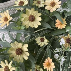ジニアプロフュージョンのお花が次々と咲いてくれてます🌼 優しいイエローがかわいい〜💛 白い葉っぱのアルテラナンテラは、一時虫に食べられてしまったけど、なんとかおさまりました😅 白い葉っぱ、美味しかったのかな🐛
