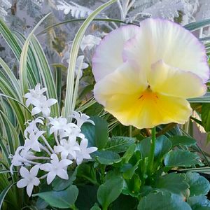 おはようございます。 一目惚れしてお迎えしたビオラ、紫色の縁取りがお気に入りです💛* 終わりゆくペンタスさんと共にコラボしてみました😊