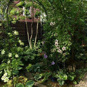 クレマチスの「テッセン」と「白万重」が咲き始めました♪下の方だけは誘引してましたが、途中から諦めたらあっという間にアーチの上まで行ってしまいました(笑)上の方が咲くのはまだ先ですね〜♪ (*´ω`*)