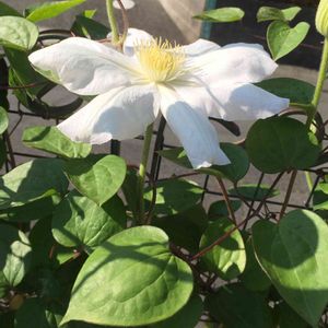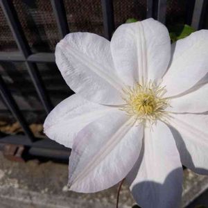 白いテッセンが開きました(((o(*゚▽゚*)o))) 花の径が20㎝近くあります いつもフェンスの上で空に向かって咲くので もう少し下で眺めたいのになーと思うのですが...