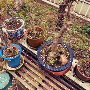 おじいちゃんの盆栽たち。 まだ寒いけど、春はもうすぐ🌸 梅の花びらがもうちょっとだよ〜と春のシャワー❣️🌸