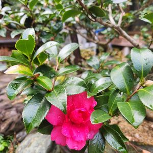 「シシガシラ」 獅子頭 12/1 チラホラと咲き始める 別名→カンツバキ ※ツバキとサザンカの双方の性質を合わせ持つ