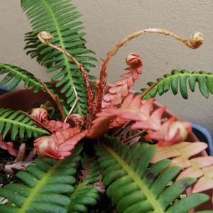 シシガシラ 毎月4日はシダの日🏷️ 獅子のたてがみのような、というのが命名の由来だけれど、 胞子葉の赤い新芽は雄々しく立ち上がっている(⌒‐⌒) 赤いのは胞子葉だけかと思っていたが、栄養葉の新葉も赤くなっていた株に出会う🎵