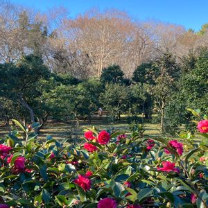万博公園外周の大阪大学正門前にて「シシガシラ」をパチリ!📸🌺🌿🤗🌞👌 関西では「シシガシラ(獅子頭)」と呼ばれ、関東では1993年以降「カンツバキ(寒椿)」と呼ぶところが多くなったそうです。🤔😊😄