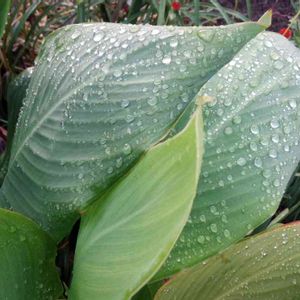 カンナの葉っぱです 雨上がりの水滴が何となく キレイです♡