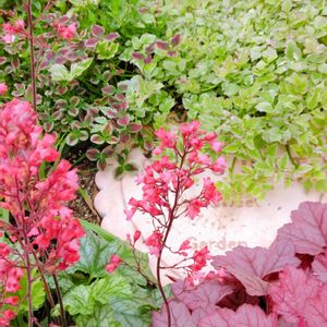 おはようございます😊 昨年、鉢で株を育ててから、庭に地植えした、宿根草🌿花が咲き始めました。 銅葉でお気に入りなんだけど、名前なんだったけ😅