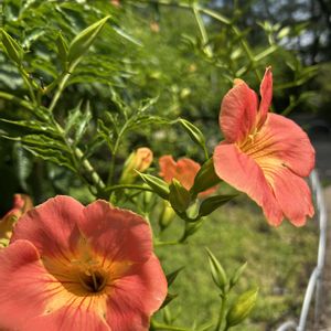 ᰔᩚ ᥫᩣ ノウゼンカズラ 公園のフェンスに絡みついて 日当たり抜群の所で開花していました🧡🧡🧡