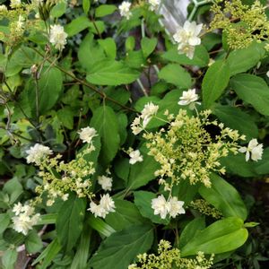 山アジサイ スターバースト 虫食い・・・😱 四隅の花茎を伸ばして、長方形になってきました😆 そういう咲き方なんだそうで・・・ 四角く咲くとか、初めて見ました。 咲き進むと四角ではなくなるらしいですが。 八重咲きアナベルとも言われるみたい。 緑→白→緑と変化して秋まで楽しめるのはアナベルと同じかな🎵 で、この方、新枝咲きなんだそう。 秋まで楽しんでから切っても翌年の花は保証付き✨ ・:*:・マジ(o´д`o)ボレ・:*:・ でね、その性質が寒冷地向きなんだとか。 雪の下敷きになって枝が折れても、春に伸びた枝に花が咲く。 へーへー🎵 柔らかい茎なのに、強いのね。 白くなる所が早く見たいぞ❣️