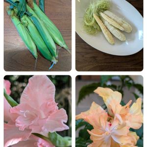 ←↑大きく育ちそうに無いので 収穫したヤングコーン🌽 ヒゲも食べられるとか❓️ ヒゲとヤングコーンて 何作ろうかなぁ〜🤤 ↓←グラジオラスピンク🩷 ↓→ハイビスカス🌺 ちょっと変わった咲き方なんです