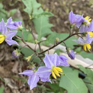 ワルナスビ ナス科 山地、川沿いのちょっとした荒れ地に、綺麗な花を咲かせています。 茎や葉柄には鋭い刺があり要注意植物です。 黄色いミニトマトに似た実が付きますが有毒なので、食べないで┅ね😅。