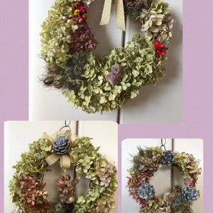 訂正とお詫びいたします🙇♀️ ヘクソカズラの蔓使用としましたが主に『アオツヅラフジ』の蔓使用です。 先日、娘の要望でドライフラワー💐と籠にアレンジしたのを届けた時に、娘がリースも欲しい...って 「楽天で購入しようと思ったけど、高くて...❣️」ですって‼️ 残りのドライフラワーとヘクソカズラの蔓を丸めた物で作って遊んでました😆 ドライフラワーの種類が少なく出来上がりは似たような物ばかり、花の豊富な時期に眺めたり花瓶に飾るだけで...もっといっぱいドライフラワーに出来たのに😞 サイズは直径30㎝25㎝20㎝の3つで、アナベル、紫陽花、ノリウツギ、ニゲラ、薔薇の実、他、松ぼっくりだけダイソーから調達 柊かクリスマスホーリーが手に入ったら、もっとクリスマス気分のリースになったのだが... 来年に向けて『クリスマスホーリー』を購入して植えることにしました☺️