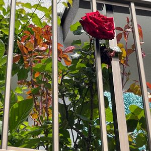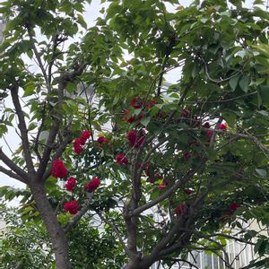 この〜木なんの木?気になる木! 一見すると赤い花が咲いている木⁉️ 実は、桜の木に絡んだ赤い薔薇🌹 みんなが見上げる不思議な木😅