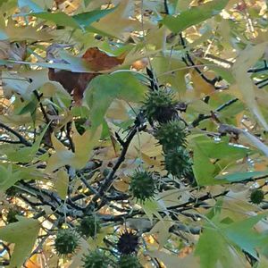 おはようございます🙇♀️ イガイガがいっぱいです⚠️ モミジバフウ もみじの形をした大きな葉っぱ 緑色から黄色に紅葉します😙 北・中央アメリカ原産 日本へは大正時代に渡来したそうです🤗