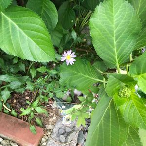 薄い色合いのミヤコワスレと紫陽花のコラボです。 どちらもこれから花🌼🌸が咲いてきます。 鬱陶しい梅雨には、一服の清涼剤になりますね。