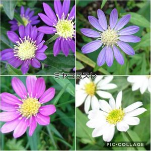 5/27(月)⑤ ちょっと前に綺麗に咲いていたミヤコワスレ やっと4色コラージュできました🤗🎵 左上の濃い紫色はお花屋さん。 あとの薄紫、ピンク、白はマンションの庭に別々の場所に咲いていました💡 ミヤコワスレで固めてくれたら綺麗なのになぁ~って植えてる方が違うのでしょうね😅💦