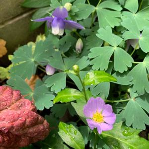 雨の朝です。 裏庭のミヤマオダマキとミヤコワスレ咲き始めました。 ちょっとだけ和の空間になってます😊