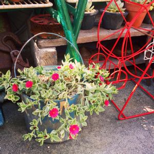 ペンキ缶に斑入りのベビーサンローズを植えました。