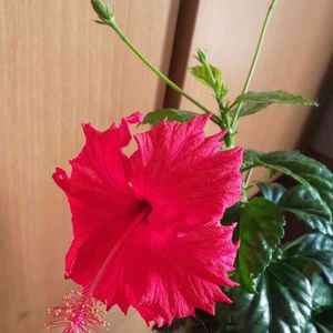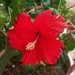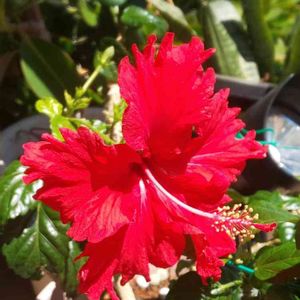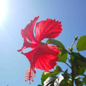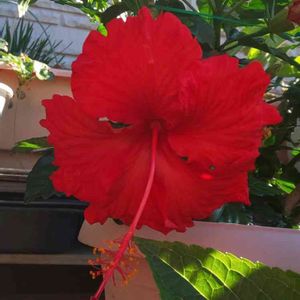 こんにちは👋😃 今日は、雲一つ無い良いお天気です☀️ 真っ赤なハイビカス、 今年も大きく咲きました🌺
