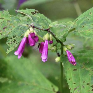 ジャコウソウ(麝香草) ピンク色で、下向きに咲いている、可愛い花を見つけました。 ん?ホタルブクロ? (-д- 三 -д-)違うなぁと思って調べたら、ジャコウソウのようです。 シソ科の植物。 「麝香」の意味で、茎や葉を揺すると、麝香のような香りがあるというのが、名前の由来だそうです。 山地の湿り気のある木陰や谷間、湿った場所に生育するそうです。 香りは、それほどしないみたい・・・だけど麝香草とは、面白い😁🎶。 日本固有種🎌