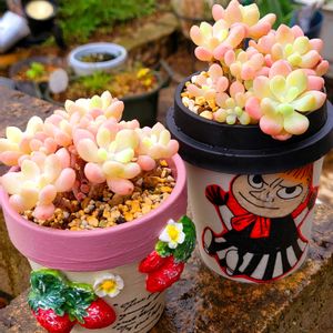 おはようございます(*^^*) 100円ショップのカフェ風プランターにスタバマークを張り付けて寄せ植えしました(⁎˃ᴗ˂⁎)⋈。
