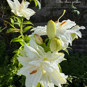 八重咲きカサブランカが咲き始めました⚜️ 一重咲きより花は小さめで開花も遅いけど 塀の外の前庭で綺麗に咲いてくれてまず( ¯﹀¯ )