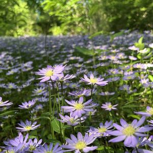 武蔵丘陵森林公園 ミヤコワスレ(都忘れ) シライトソウ(白糸草)と共存する半日陰の森に群生していました 光のライトをよけて、妖精が隠れているような静かな森でした✨