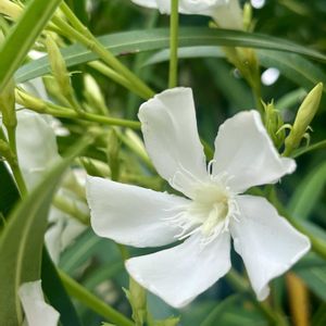 通勤途中見かけた、 純白が美しい夾竹桃 小学校へ続く歩道橋の脇に咲いています 新しい道が出来たため信号機が設けられ、どれだけの人がこの歩道橋を横断するのでしょう 多分集団登校する小学生だけかも🤔 空が重い曇り空だけど、今日一日頑張りましょう