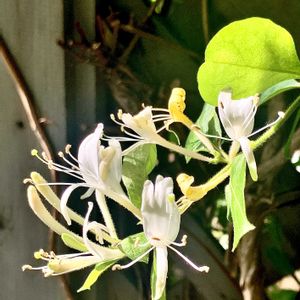 スイカズラ 香りが良いので植えたのですが…😅 蔓がウッドパネル、パーゴラ、雨樋をつたい、2階の窓まで登ってきます それに伝ってアリさん🐜たちが行列😳 枝切りなど、格闘が始まってます