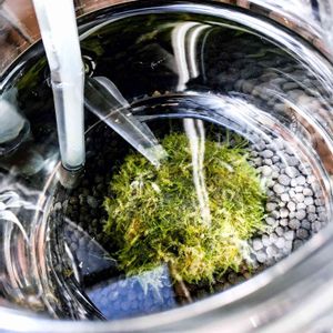 テラスで育てて 越冬したウィローモス 瓶に沈めて眺めてみると 可愛い💕 このまま アオミドロ出ないでね 我が家のテラス環境適応 の個体だから きっと丈夫だよ