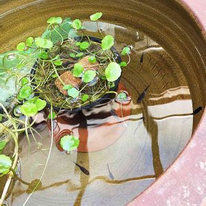 各メダカ鉢 ウォーターマッシュルーム しっかり新芽に更新しました 手前の大きな深鉢は ソイルの底で水換えいらず ごちゃ混ぜ大家族 みんな、元気に泳いでます 左下は小川ブラック 右上はみゆき みんな元気に越冬できた 良かったね
