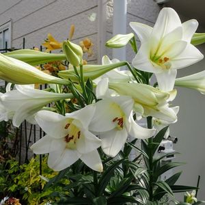 こんにちは。 梅雨空に一瞬だけ日が差しました。 昨日から一番花が咲いていた、 テッポウユリ・ホワイトヘブン(新潟産) です。(こちら向いてるのは二番花です) 秋に球根を植えた時は こんなに背が高くなるとは 思っていませんでした。 支柱で支えなきゃいけないかな。