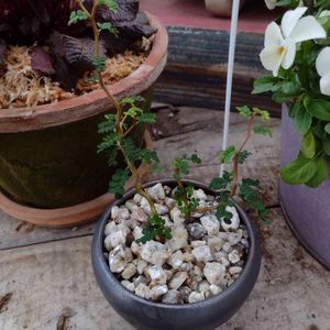 ソフォラ ミクロフィラの鉢植えも作りました! 土の表面に矢作砂を敷いています! 洋風の雰囲気も感じさせつつ侘び寂びの雰囲気も感じる作品に仕上がりました☺️