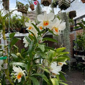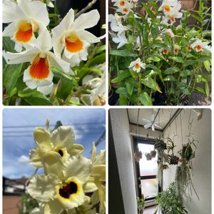 ⬆️デンドロビウム フォーミディブル、賑やかに開花中😊 ↙️デンドロビウム ビーナススマイル 寒さに当たって開花しました😄 雹で傷んでいたのでこの後植え替えましたよ。 ↘️温帯低気圧に備えてハンガーと倒れやすい鉢を室内に移動しました😅