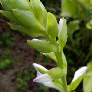 🏷️ 金曜日の蕾たち No.33 1 ギボウシが 枯れ枯れの葉の中から やっと 咲きだしました 2 池の蓮 3 アンネの薔薇 4 三時草 5 サンビリーバブル 3輪咲いて 34輪めです ここ 数日 ☔雨が 降ったので 元気を 取り戻した庭木です 🙋