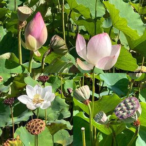 大賀蓮と王子蓮の掛け合わせだそうです。 れんこんから発芽すると純粋種だそうですが 蜂🐝などで交配された実からだと雑種に…と教えてもらいました。 実がつくと 刈り取るそうです。